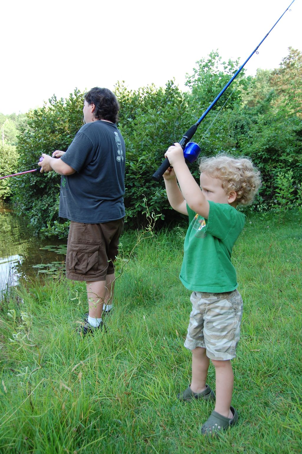 I forgot to mention in the first vacation post that there was quite a bit of fishing done yesterday evening. We have instructions from the property owners to catch as many Bluegill and Crappie fish as we can because they eat up all the minnows and it makes it harder to catch nice sized trout and bass. So between Rick, Kelsey and Griffin (who mostly just helped) we hauled in 12 fish! I was feeling bad about keeping fish we won’t eat, but then this morning we woke to find half of our take was gone – the late-night snacks of some local turtles and raccoons, no doubt. I don’t feel as bad if they’re feeding the food chain as I would if we were just throwing them in the woods.