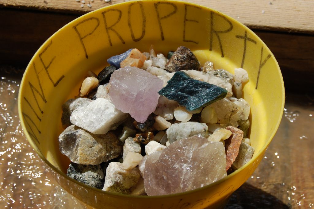 The mine offers several varieties of experiences, starting at $15 for a smaller bucket, and going up to $120 for a big one that also includes two free stone cuttings and guarantees some nice material. The stuff in the buckets is not fresh out of the ground, but is what rock hounds call “enriched” or “salted”. At first I thought that would deminish the Fun Quotient, but I was wrong!