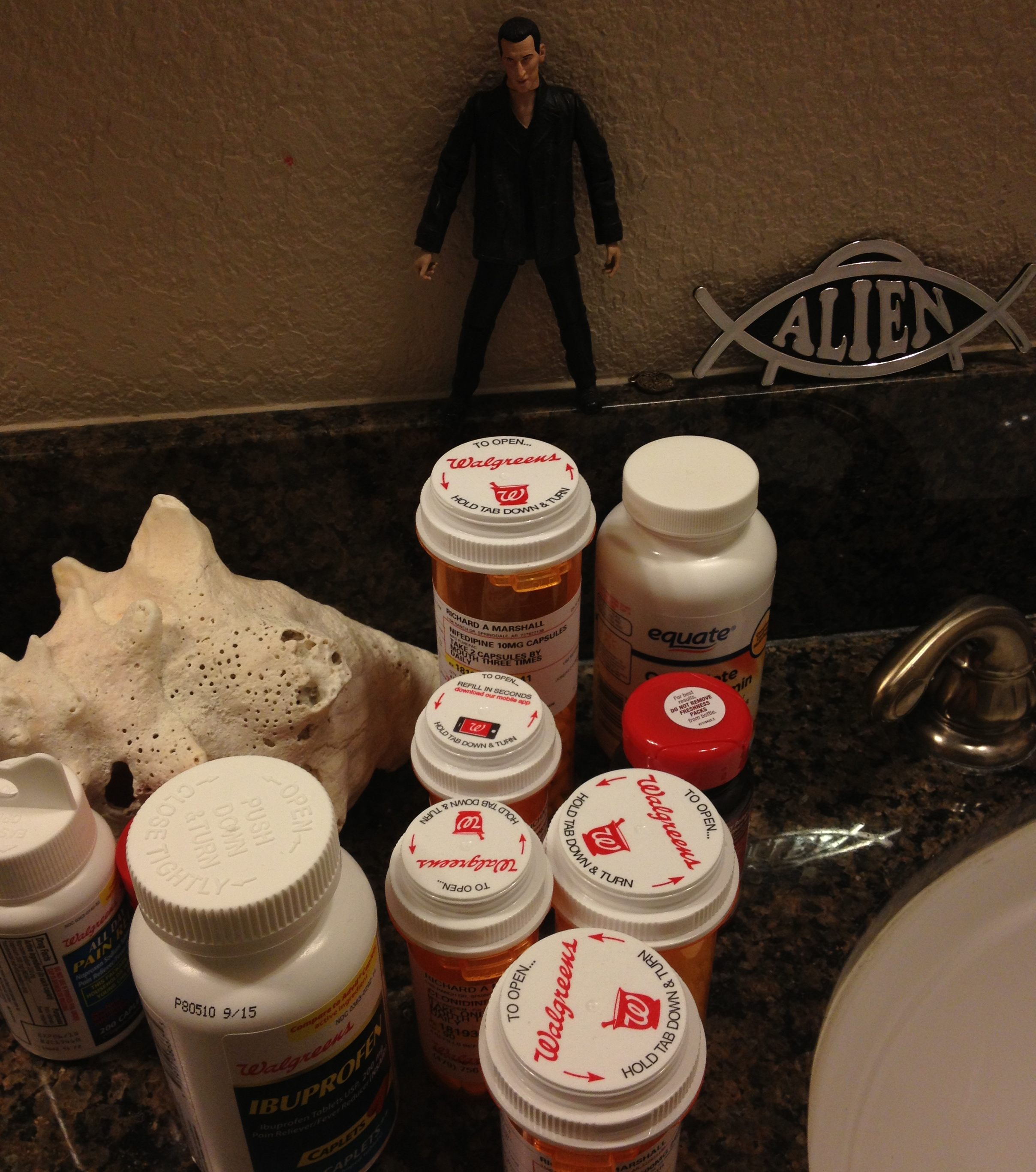 … and this selection of medication on my husband’s side of the bathroom vanity (yes, that’s the 9th Dr. overlooking the scene – we’re busy geeks around here!).