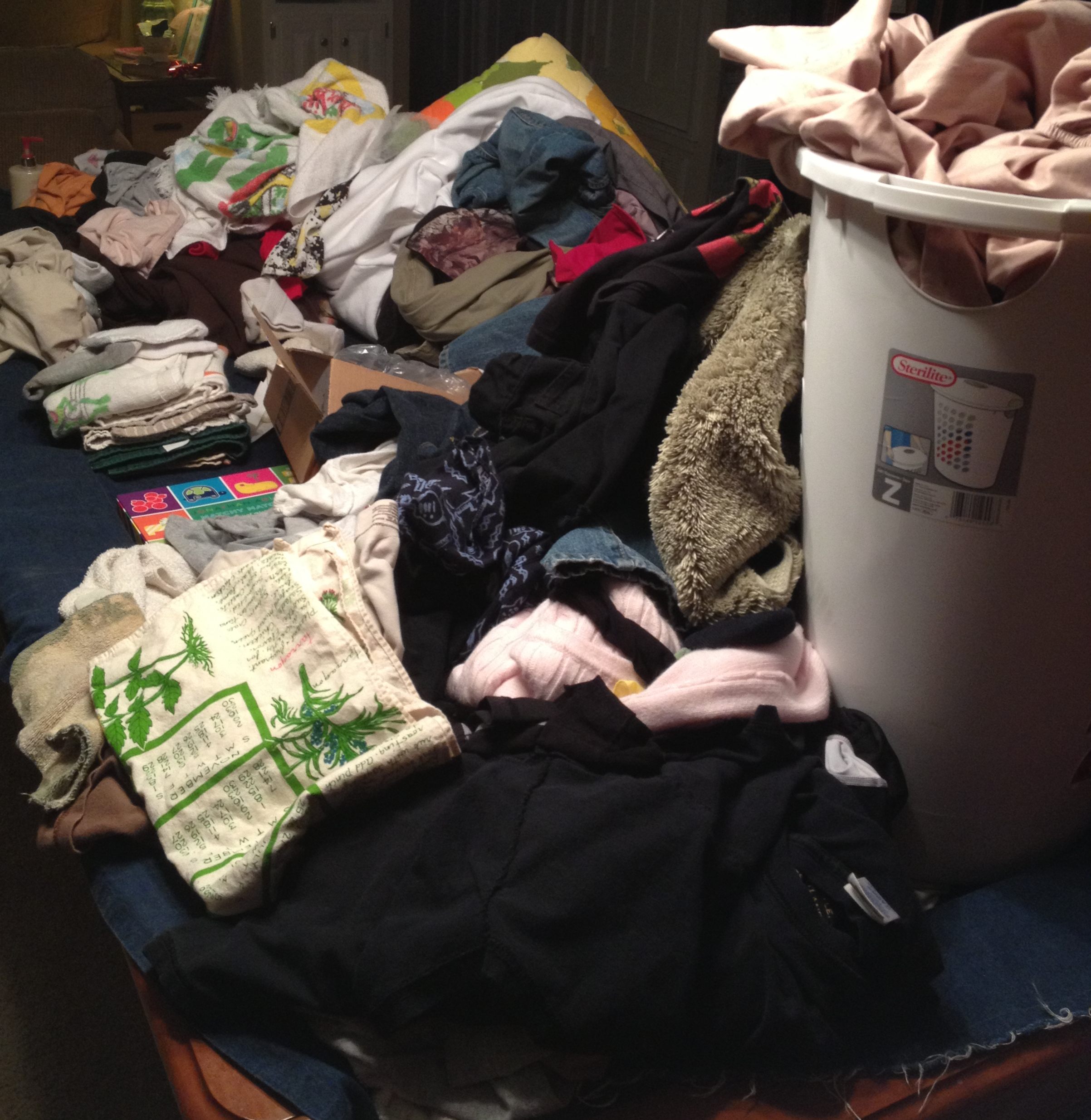 Now, any given day at my house, we’re looking at this pile of laundry… (yes, that’s a pool table underneath… we’re busy around here!)