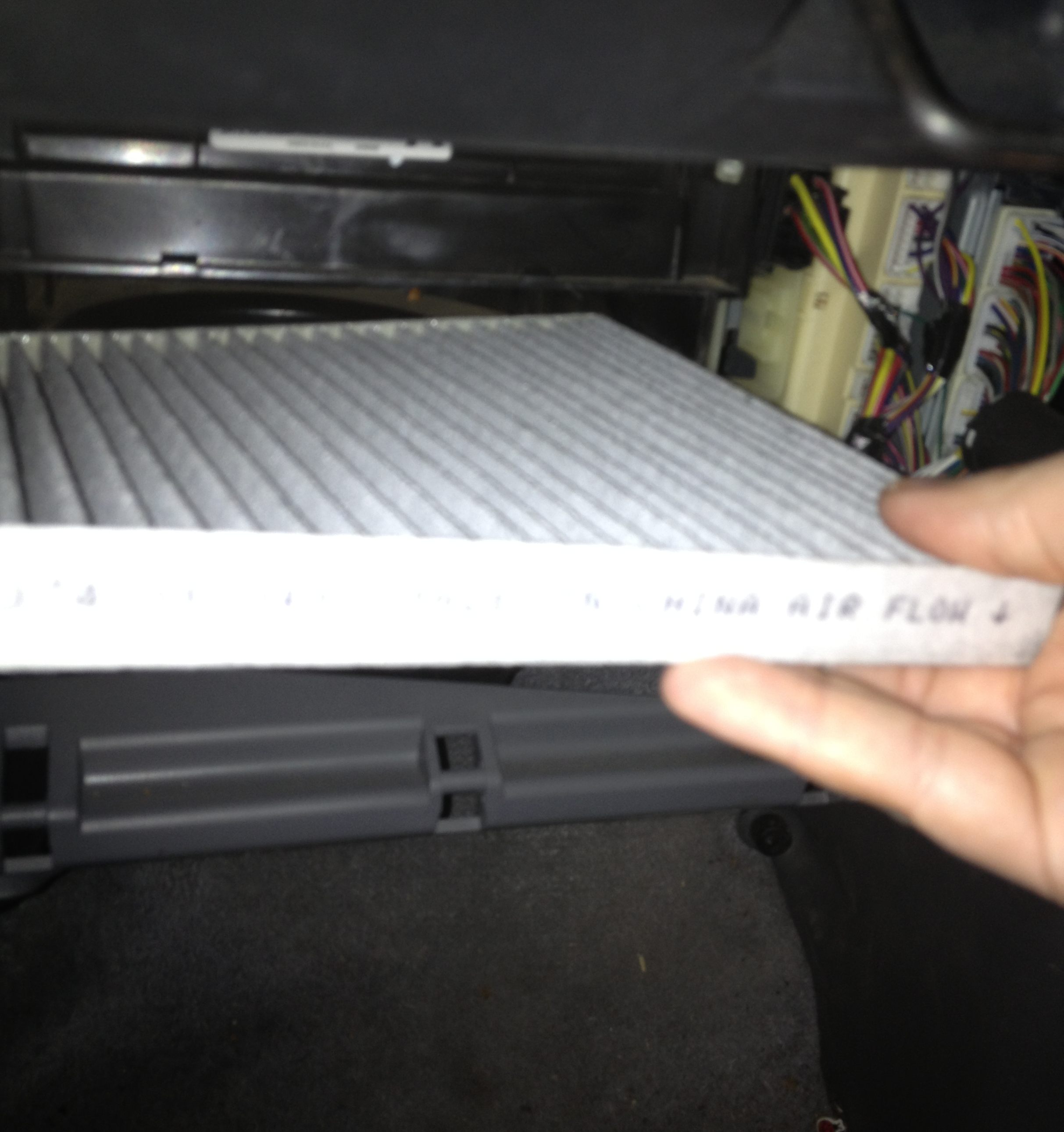 The box promised a 15 minute installation, and of course I’m assuming that’s an optimistic prediction. But seriously, it only took me 12 minutes to pop that thing in. I had to un-hinge the glove box (easy), and pull out the old filter… gross… it might be hard to tell, but the one behind is the original (which had probably been in there since we bought the truck) and it was full of grit and bits and nastiness. Can you see the sparkly shine on the new one on top? Maybe it was late and I was hallucinating a little…